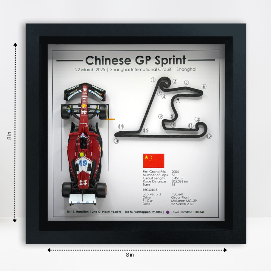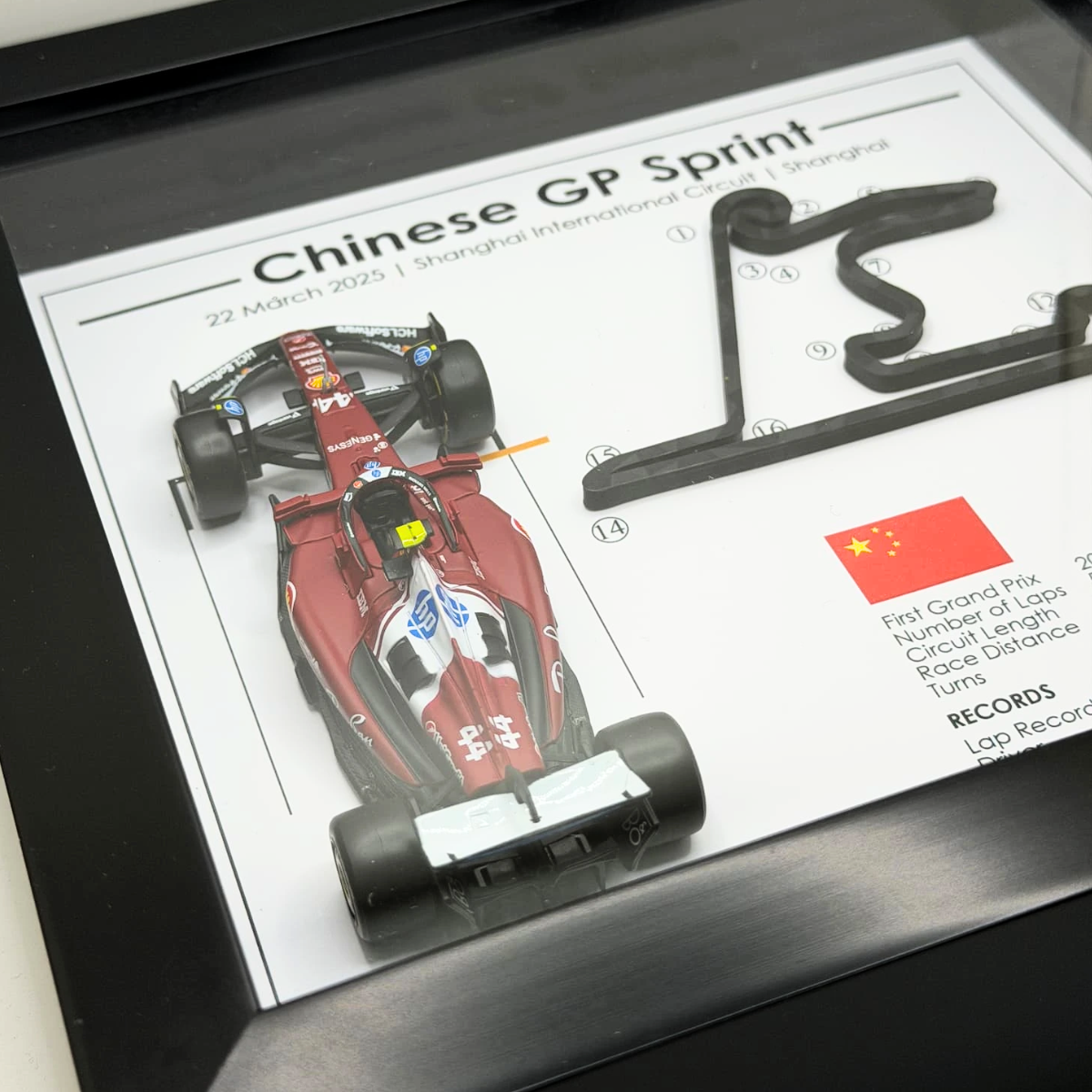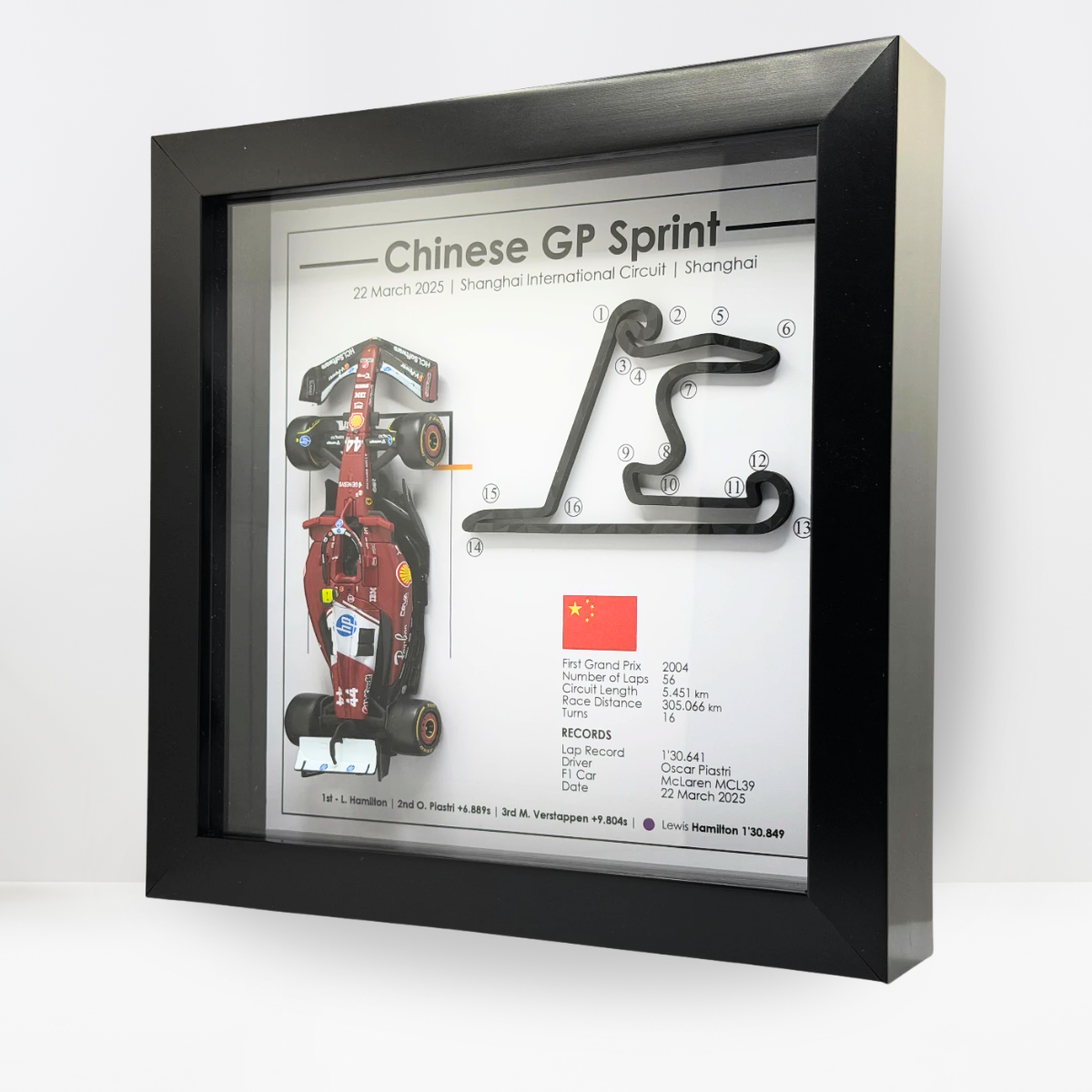 A framed three-dimensional artwork capturing Lewis Hamilton’s Ferrari SF25-44 during the Chinese Grand Prix Sprint at Shanghai.